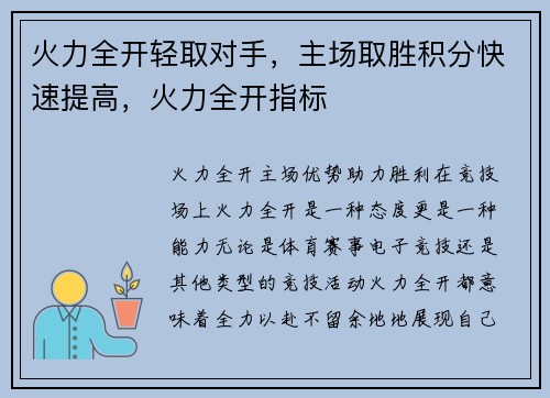 火力全开轻取对手,主场取胜积分快速提高,火力全开指标