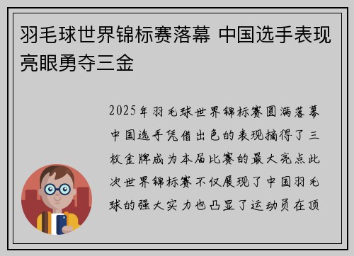 2025年羽毛球世界锦标赛圆满落幕,中国选手凭借出色的表现摘得了三枚金牌,成为本届比赛的最大亮点。此次世界锦标赛不仅展现了中国羽毛球的强大实力,也凸显了运动员在顶级赛事中的不懈拼搏精神。在男子单打、女子双打和混合双打项目中,中国选手的精彩表现令人振奋。本文将从中国选手的整体表现、各项比赛的亮点、顶级选手的出色发挥以及中国羽毛球的未来展望四个方面,对此次羽毛球世界锦标赛中的精彩瞬间进行详细阐述,并总结中国羽毛球在世界舞台上的新辉煌。